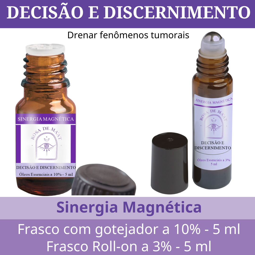 Decisão e Discernimento é uma Sinergia Magnética “Decisão e Discernimento” é indicada para auxiliar a pessoa a desenvolver capacidade de tomada de decisões com discernimento para fazer boas escolhas. Esta Sinergia Magnética atua nos processos de Drenagem de Fenômenos Tumorais e de Acidentes vasculares, desde os eventos tumorais e vasculares mais simples aos mais graves tais como edema, cistos, pólipos, abcessos, hiperplasias, neoplasias/câncer (maligno ou benigno, com ou sem metástase), hematomas, isquemias, aneurismas, acidente vascular cerebral (AVC/AVE). Esta sinergia é composta por óleos essenciais de Rosas, Olíbano, Nardo, Gálbano, Ervas aromáticas e Azahar. É produzida artesanalmente com matéria prima de primeira qualidade, seguindo procedimentos ritualísticos utilizando aromas, cristais, flores, geometria, música e comandos holográficos.