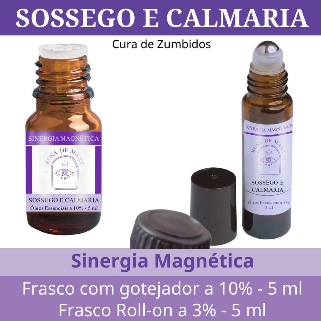 A sinergia magnética Sossego e Calmaria é recomendada para o tratamento de zumbidos em geral e estados de desassossego. Essa sinergia contribui para a redução da ansiedade, agonias, inquietudes psicoemocionais, pois tem o potencial de trazer sensação de paz e quietude. Sossego e Calmaria contém notas aromáticas dos óleos de Almécega e Sândalo Branco e é produzida artesanalmente com matéria prima de primeira qualidade, seguindo procedimentos ritualísticos utilizando aromas, cristais, flores, geometria, música e comandos holográficos.